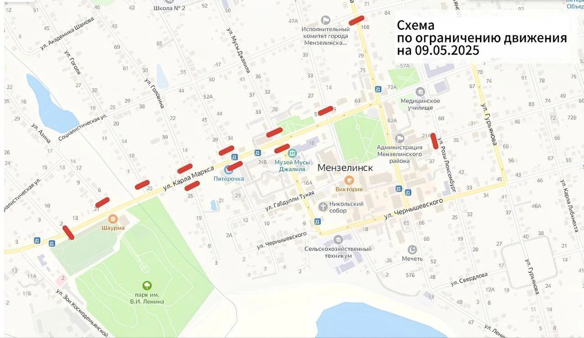 Уважаемые мензелинцы, в связи с проведением 80-ой годовщины Победы в Великой Отечественной войне в городе Мензелинск 9 мая 2025 года в целях обеспечения безопасности дорожного движения в период с 7.00 ч. до 13.00 ч. вводится временное ограничение движения транспортных средств на участке автомобильных дорог на пересечении: ул. Ленина - ул. Социалистическая; ул. Тукая - ул. Р. Люксембург; ул.К. Маркса - ул.Азина; ул. К. Маркса - ул. Некрасова; ул. К. Маркса - ул. Гоголя; ул. К. Маркса - ул. Головина; ул. К. Маркса - ул. Красноармейская; ул. К. Маркса - ул. М. Джалиля; ул. К. Маркса - ул. Коммунистическая. Просим заранее планировать маршрут!