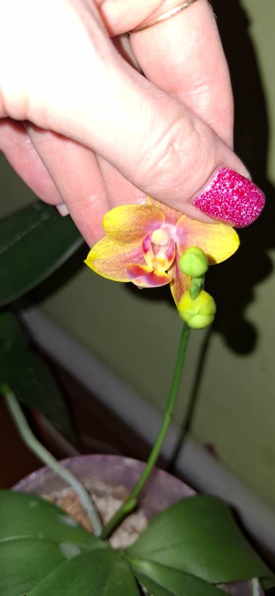 Добрый вечер, Мои Дорогие Друзья 🌸! Расцвела у меня орхидеечка скорее всего из той партии, что три года назад я покупала в садовом центре "Летто". Стоимость у этой орхидеи была не больше 500р, а интерес и чувство обладания новой орхидеей подогревали во мне "охотника на орхидеи🤤☺️" . Конечно, когда я видела старый ценник 2800 и тут новый 500р, вопрос о покупке не стоял. А так как на тот момент у меня была "коллекция из 6 - 10штук, то я не раздумывая купила её. Партия этих орхидей была привезена из теплицы "орхорай", тогда видимо они сотрудничали. И конечно я понимала, что это не просто малышка, а сортовая красота. И вот спустя время она распускается и я вижу эту красавицу 😍! Это её второе цветение, точнее вторая попытка порадовать меня. В первый раз, когда она дала цветонос листьев нормальных было три, а так как при цветении орхидеи важно количество листьев , я приняла решение удалить его. Подумала, что я там не видела, пусть листья наращивает. Но и листья у неё скажу я Вам немног
