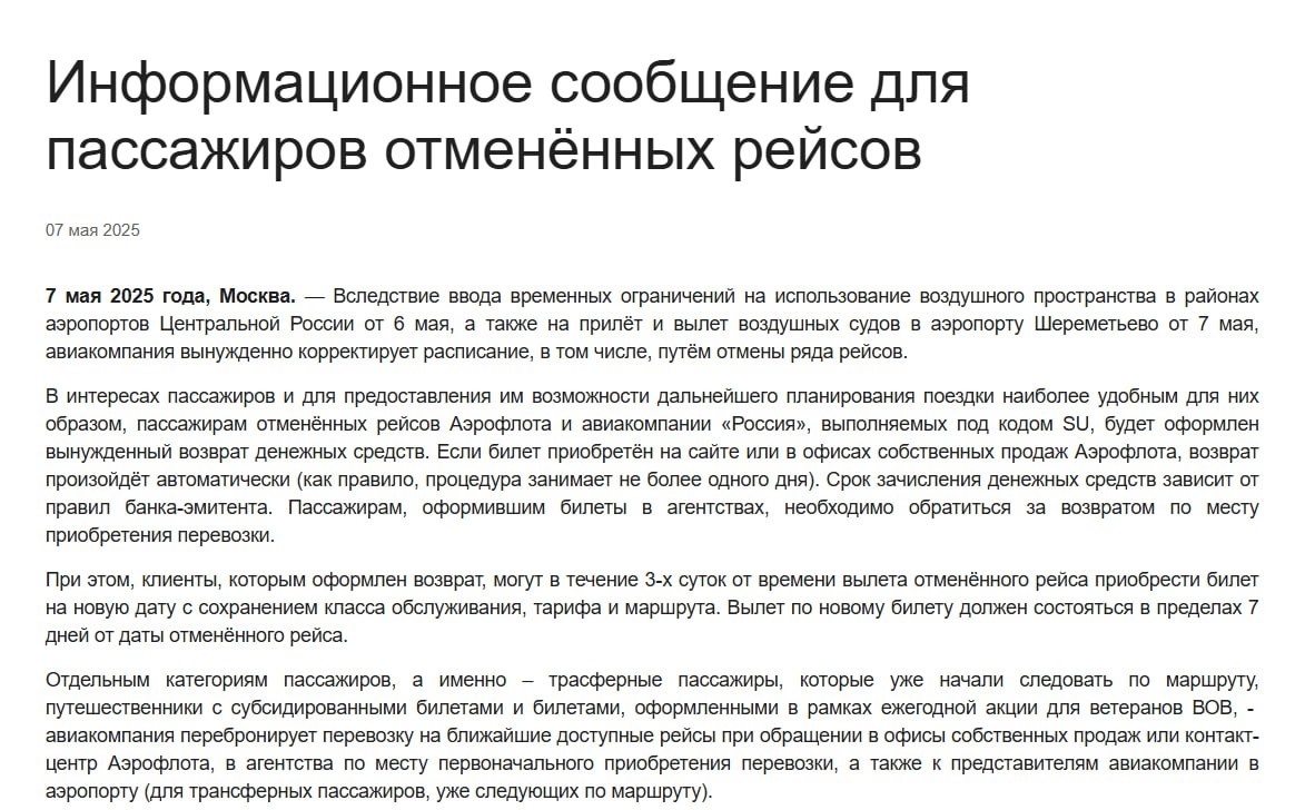 ✈️ «Аэрофлот» вернёт деньги за билеты на рейсы, отменённые 6 и 7 мая, — авиакомпания