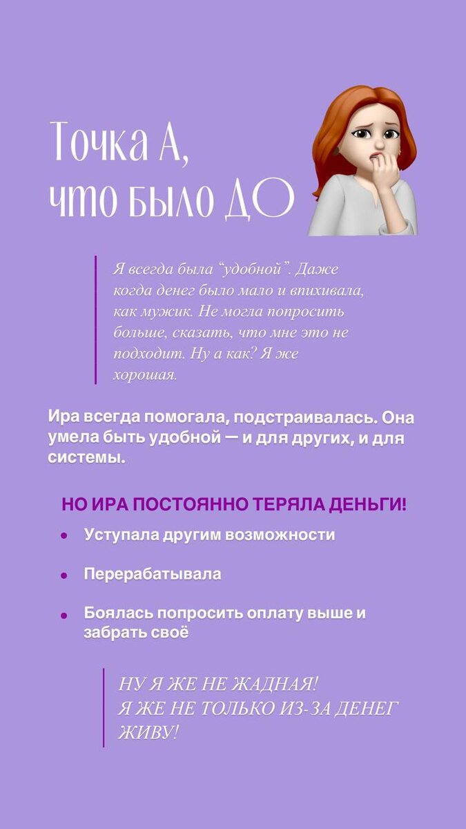 Я всегда была “удобной”. Даже когда денег было мало и впихивала, как мужик. Не могла попросить больше, сказать, что мне это не подходит. Ну а как? Я же хорошая. Помните мою фокус-группу, которая тестово прошла интенсив и все активности на месяц нумерологии? 🤩 Так вот Ира - это вторая участница (первым был Андрюша), обычный сотрудник в найме, иногда делала небольшое расклады на таро за деньги. 💜Сначала просто неприятно: упустила проект, на который реально могла претендовать, потому что его очень хотела получить коллега. 💜Потом побольше: ей урезали премию, а она даже не спросила почему. Боялась, что ее посчитают жадной хамкой или сделают выговор. 💜И совсем крупно: раз за разом соглашалась на переработки, работы в выходные, и брала меньше, чем стоила её работа. Но когда деньги уходят — с ними уходит не просто сумма. Уходит ощущение своей ценности. 🤩 Уходит вера в то, что ты заслуживаешь большего. И вот Ира сидит на кухне, пьёт кофе и думает: Я, наверное, просто не рождена, чтобы