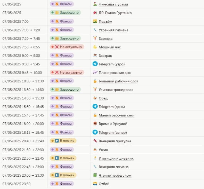 ✏️ Распорядок дня Это мой распорядок дня в Notion. Он автоматически генерируется, затем я кажое утро удаляю лишнее для постройки под ранее запланированные встречи и забег начинается. Успешным считается день, когда я пробежал все чекпойнты. За этой вот простой табличкой стоят годы экспериментов над собой. Мне кажется, что этот распорядок достаточно сбалансирован, он обеспечивает 6,5 часов дипворка ежедневно, при этом я умудряюсь много находиться на улице, нахаживать 10-20 тысяч шагов, проводить 2 часа в день с дочкой и ежедневно нетворкаться с интересными людьми во время обеда и вечерних прогулок. Ну и в Телеграме я очень активен, пишу, модерирую, администрирую сообщества. Да, такой график не оставляет времени на полежать, но так точно можно жить и жизнь эта насыщенна, разнообразна и приятна. Запостил я этот график в один бизнес-чатик, где меня подняли на смех и сказали, что работаю я мало. Что такое шесть с половиной часов, когда люди вон сутками работают? Сразу вспомнилось, как в