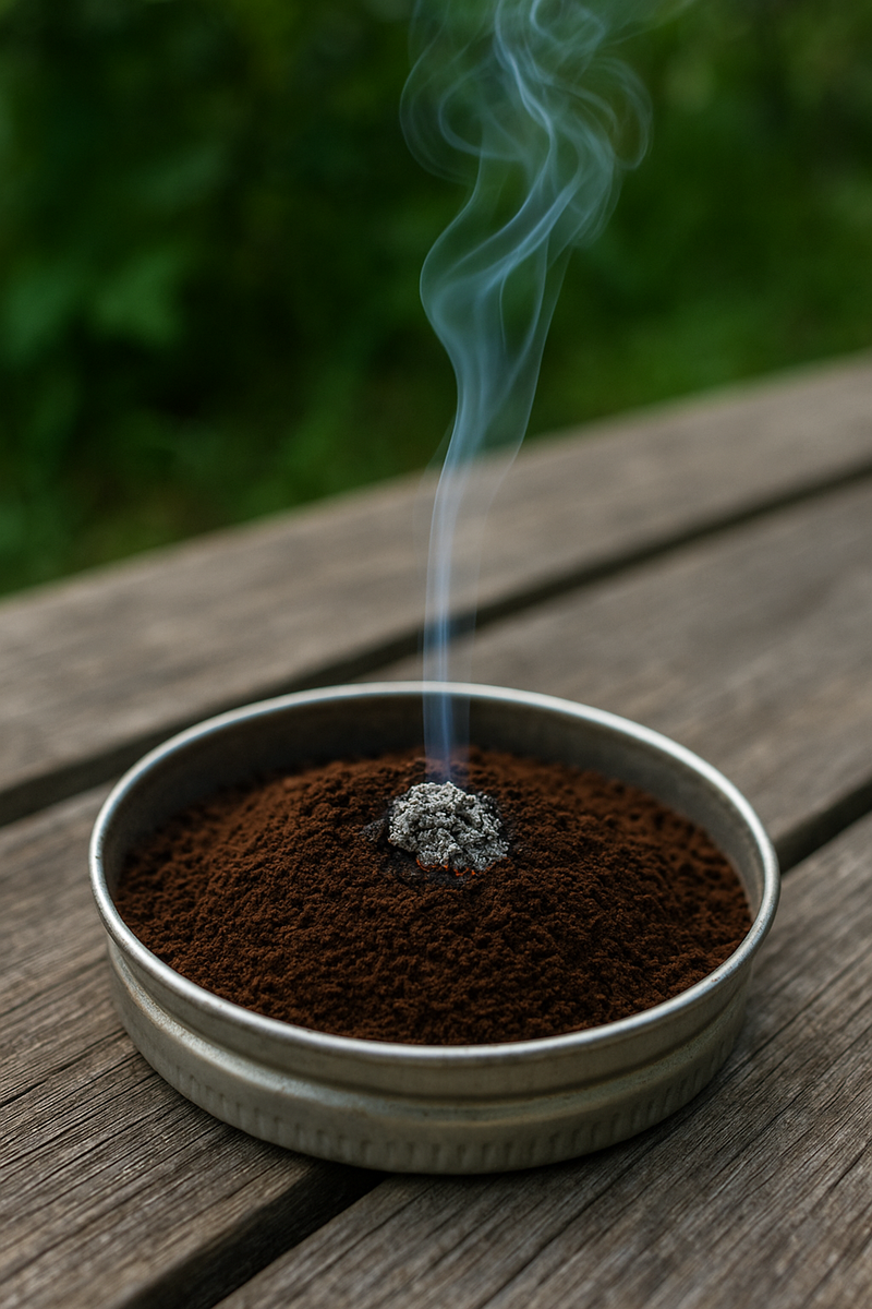 “Комаров можно выгнать дымом — но не любым. Вот этим они вообще не переносят”. Гуща не горит, а тлеет, как спираль. Аромат — лёгкий кофейный, дым — почти незаметен.