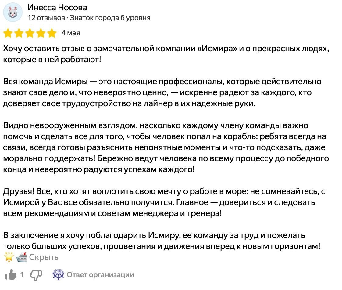 Спасибо за теплый отзыв ❤️ Друзья, если наш сервис помог вам с трудоустройством, будем благодарны за ваши отзывы на Яндекс Картах — это очень ценно для нас и помогает другим принять решение. 🚢✨ Ссылка тут