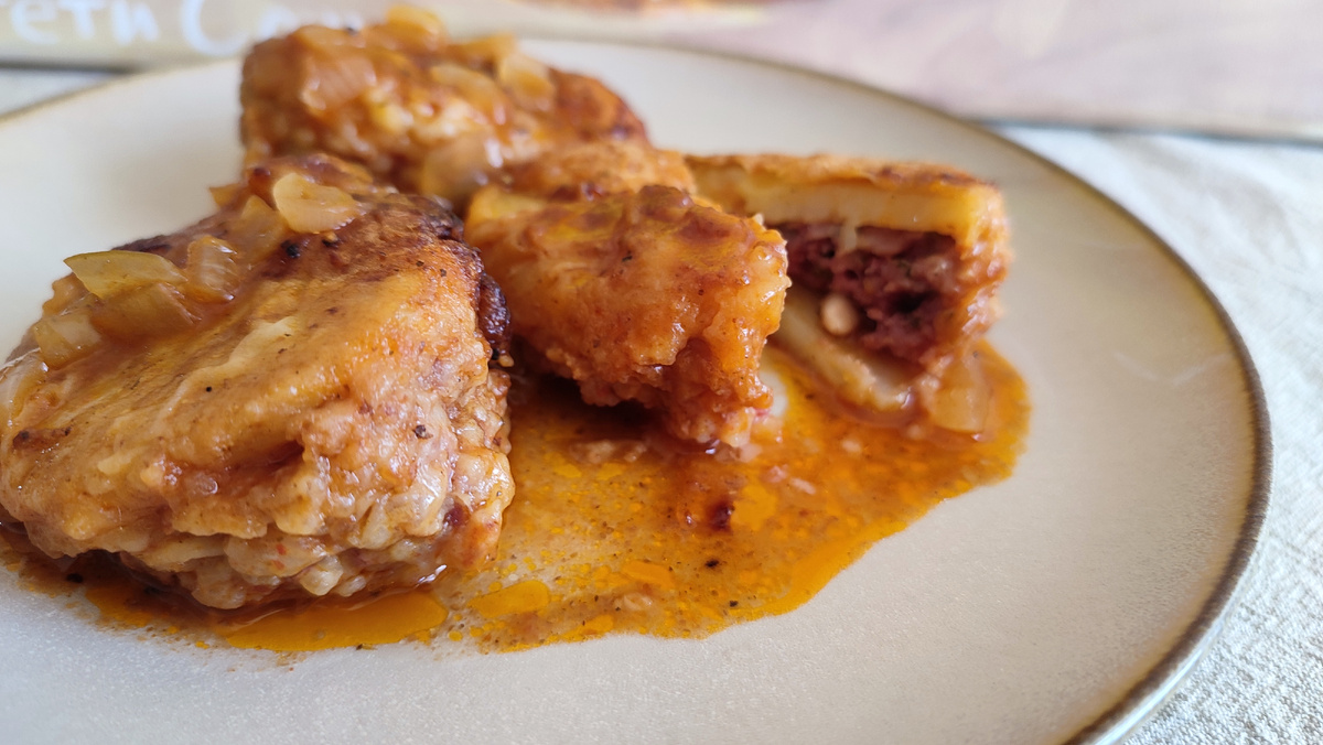 Мафрум — традиционное блюдо североафриканских евреев, которое прижилось и в Израиле. Это фаршированный картофель, обжаренный и тушёный в томатном соусе с множеством специй. Картофельные "кармашки" начиняют мясным фаршем с луком, зирой и паприкой, обжаривают до румяной корочки и затем тушат в густом соусе с томатами и чесноком. Мафрум — это тот самый случай, когда процесс важен не меньше результата. Да, нужно немного повозиться с картофелем, сделать надрезы, аккуратно начинить фаршем, потом обжарить и ещё протушить в соусе. Но именно в этом и есть вся прелесть. Мафрум — блюдо медленное, неторопливое, и когда оно готовится на плите, дом наполняется тем самым тёплым ароматом специй и томатов. Л
