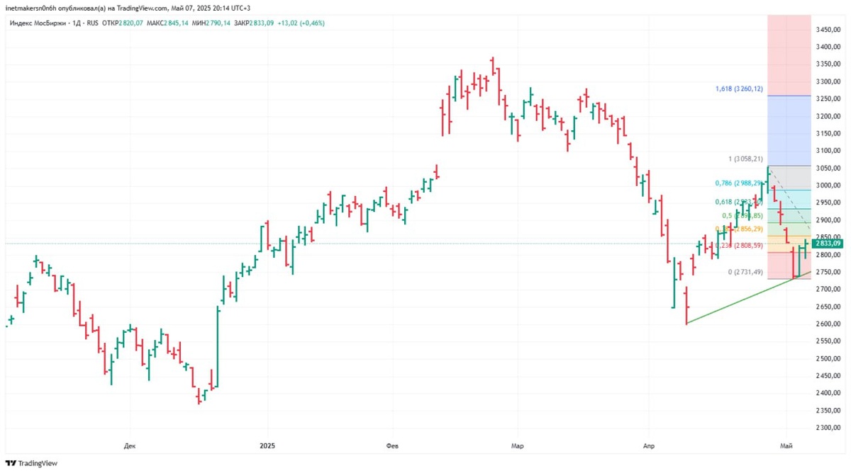 ❗️7 мая российский фондовый рынок завершил день в “зеленой зоне”, индекс МосБиржи укрепился на 0,46% до уровня 2833,09. Сегодня техническая модель роста продолжала действовать, рост хотя и небольшой, но уверенный, сохраняющейся и в отдельных акциях. При этом никаких существенных новостей сегодня не было, как по компаниям, так и в вопросе украинского урегулирования. Завтра рынок продолжит свою работу, скорее всего, при минимальном новостном фоне, что позволяет нам надеяться на то, что бычьи технические настроения будут преобладать. 👉 Наш российский 🇷🇺 портфель — индекс FTinvest.ru прибавил 0,68% и достиг уровня 787,3153, зарабатывайте вместе нашим индексом FTinvest.ru с услугой автоследования. Курс доллара США по данным ЦБ РФ сегодня снизился на 0,13% и составил 80,8612 руб. Нефть WTI ниже на 1,05% до $58,47 за баррель, а Brent на 1,09% и стоит $61,47. Золото сегодня ниже на 0,89% и стоит $3392,41 за тройскую унцию. Биткойн растет на 2,60% до $96848,67. Индекс S&P 500 выше на