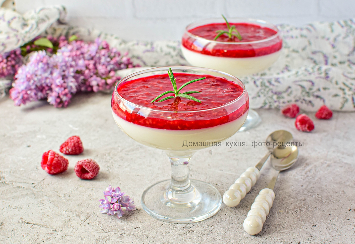Нежный вкусный десерт из сливок с ягодным дополнением. Ягодный слой можно сделать из малины, клубники, вишни, черники или брусники. Для приготовления десерта залейте желатин холодной водой и оставьте постоять на 20 минут, чтобы желатин набух. Сливки соедините с молоком. Добавьте сахар. Поставьте на огонь и доведите до кипения. В горячие сливки добавьте набухший желатин. Помешивайте, чтобы он полностью растворился. Процедите всю массу через ситечко. Готовую массу разлейте по креманкам и уберите в холодильник на 2-3 часа для застывания. Для ягодной начинки смешайте малину с сахаром и крахмалом. Ягоды можно взять замороженные. Если малина не сочная, то допускается подлить немного воды. Помешивая, доведите все до кипения. Начинка немного загустеет. Снимите с огня и остудите. На застывший десерт выложите ягодную начинку. Украсьте на свой вкус. Приятного угощения! Так же вам понравится: Шоколадная панна-котта Яблочный пирог на творожном тесте Кекс с черникой