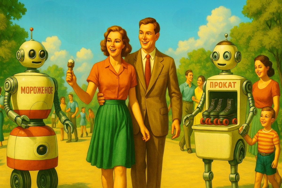 По парку радостно гуляли люди, но что-то было не так. Мороженное продавали совсем не люди. Это были роботы! Прямо как в старых фильмах. Только вид у них был добрее. С порядком тут тоже было всё хорошо. Вокруг летали странные аппараты следящие за всеми. Они вежливо предупреждали выбрасывать мусор в урны и не выбегать на проезжую часть.