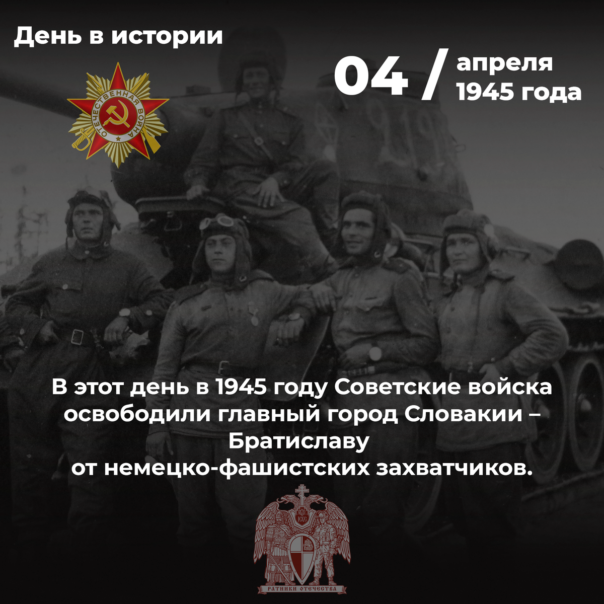 4 апреля 1945 года советские войска освободили главный город Словакии — Братиславу от немцко-фашистских захватчиков. Вечером в Москве в 22:00 в честь героев штурма Братиславы прогремел торжественный салют — 24 артиллерийских залпа из 324 орудий. За отличные боевые действия приказом Верховного Главнокомандующего Вооруженными Силами СССР была объявлена благодарность войскам, участвовавшим в боях за освобождение Братиславы, а наиболее отличившиеся в боях за овладение городом соединения и воинские части были представлены к присвоению наименования «Братиславская».