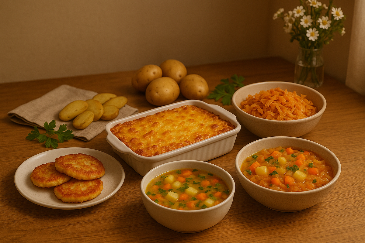 Картошка и овощи — это основа бюджетной кухни, и из них можно приготовить настоящие шедевры. В этой статье я собрал пять рецептов, которые помогут создать уютную атмосферу без лишних затрат. Эти блюда идеально подойдут для ужина после рабочего дня, а их простота порадует даже начинающих кулинаров. 1. Картофельная запеканка с морковью Нарежьте 4 картофелины и 2 моркови тонкими кружочками. Выложите слоями в смазанную маслом форму, посыпая солью и перцем. Залейте смесью из 2 яиц и 100 мл молока. Запекайте при 180°C 40 минут. Это сытное блюдо, богатое витаминами, особенно витамином A из моркови. 2. Овощной суп с картофелем В 1 л воды отварите 3 нарезанные картофелины, 1 морковь и 1 луковицу (порежьте кубиками). Добавьте соль, перец и 1 лавровый лист. Варите 20 минут, в конце посыпьте зеленью (если есть). Этот суп лёгкий, но питательный, и отлично согревает в майский вечер. 3. Картофельные оладьи Натрите 3 картофелины на крупной тёрке, добавьте 1 яйцо, 2 ст. л. муки, соль и перец. Жарьте на
