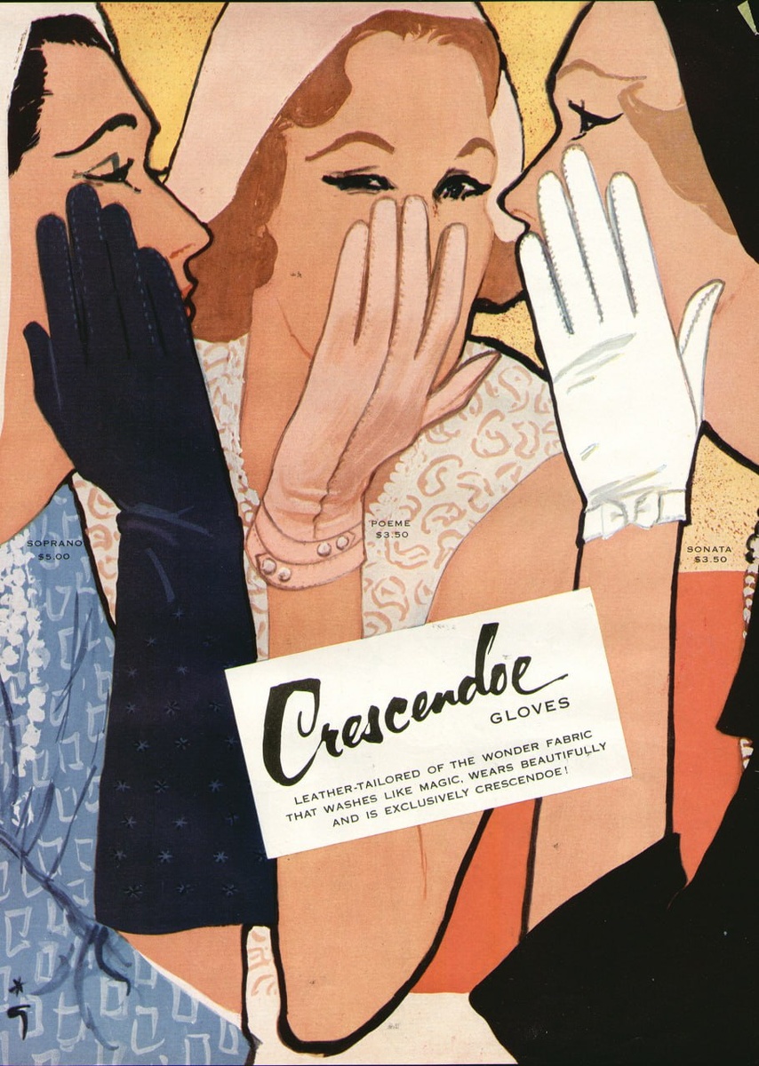 На сайте в наличии вот такая яркая и прекрасная рекламная иллюстрация Рене Грюо для бренда перчаток Crescendoe, 1958 год