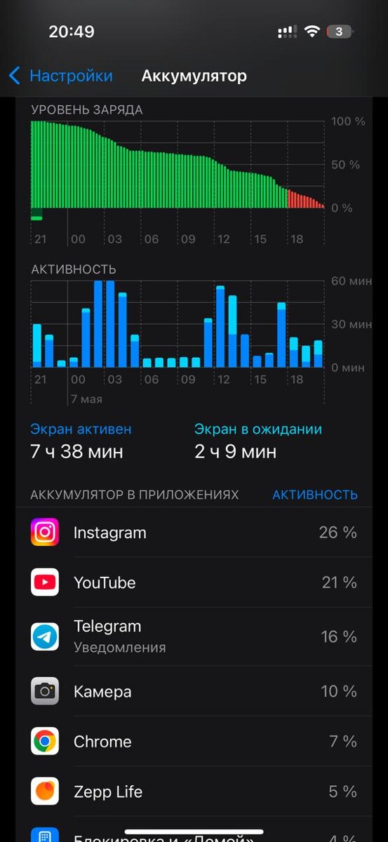 В ответ на пост ⚡️Автономность iOS 18.5 RC Снял с зарядки в 21:48 и активно пользовался до 06:00, а затем с 11:00. В итоге в 20:49 оставалось 3%. По условиям все стандартно для меня: LTE на двух симках, вайфай/сотовая сеть 50/50 по времени. Яркость 50%. Как обычно соцсети, браузер, ютуб, навигация. Айфон 16 Про, емкость аккума 100%. Always On и 120гц включены. В итоге около 7,5 часов экрана примерно. Для того, когда я нахожусь в мск это неплохой результат, на бетах было похуже! Как у вас?🧐