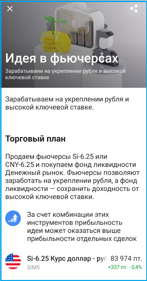 Недавно я копалась в мобильном приложении от Т-Инвестиций и нашла там "идею в фьючерсах". Правда банк не забыл приписать, что это не индивидуальная торговая рекомендация, хотя он состоит в нужных реестрах и имеет право давать рекомендации в отличие от меня. Я решила разобрать ее и пояснить. Т-Банк предлагает заработать на укреплении рубля и высокой ключевой ставке. Для этого он говорит, что можно: При этом брокер предлагает выставить следующие заявки: Идею я нашла когда Si торговался по 83952, а CNY по 11.5. Ну и банк предлагает продать фонд ликвидности как только фьючерсы будут куплены. Напомню, изначально фьючерс продается. Но поскольку при продаже фьючерса как и при его покупке на счете блокируется гарантийное обеспечение, если у инвестора достаточно средств на счете, то он не будет платить комиссию за маржинальную торговлю. У фьючерсов пройдет экспирация 19 июня 2025 года, то это торговая идея может проработать чуть больше месяца. Предлагаю считать, что она отработает 40 дней, чт
