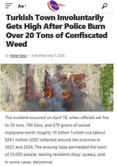 В турецком городе Лидже полиция сожгла 20,7 тонны конфискованной марихуаны, собранной за два года рейдов. Густой дым от костра накрыл весь 25-тысячный город, вызвав "необычные последствия" у местных жителей.