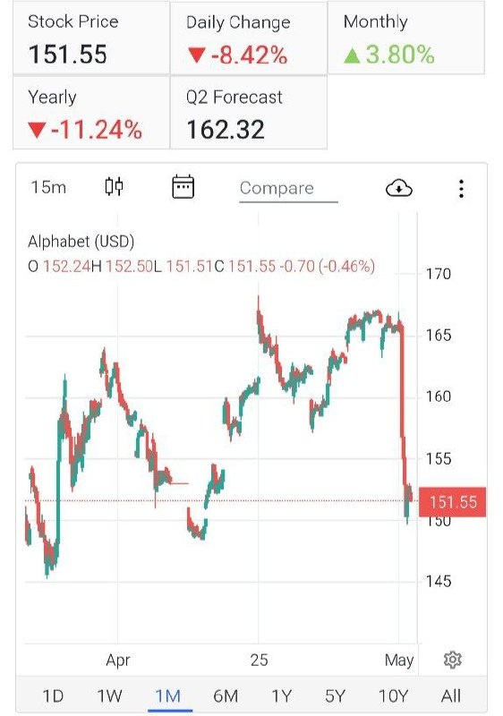 Быки, гляньте ещё на Alphabet Бумажку сегодня втоптали в грязь, а почему? Внезапно, появились новости, что ИИ угрожает поисковому бизнесу. В частности, Apple ищет вариант замены дефолтного поиска гугла. Этим новостя уже год. Идёт целенаправленная распродажа после замечательного квартального отчета @marketheart