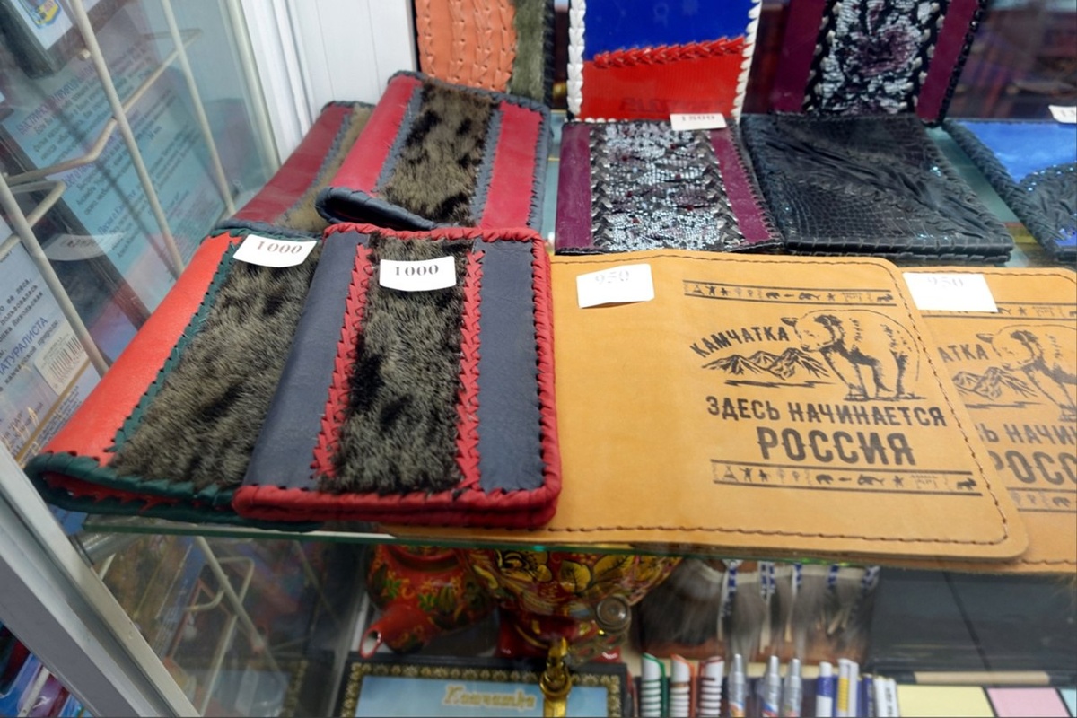 Петропавловск-Камчатский В сувенирке (расположены в основном на рынках и в аэропорту в стеклопластиковых павильонах) можно купить многое. Например, обложку для паспорта со шкурой медведя. Куски лавы, если вы их не насобирали на вулканах. Или поделки из моржовых костей и моржовых пенисов. © Антон Квитанцев