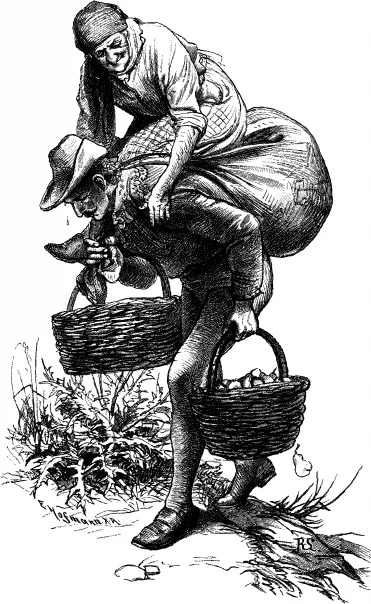 Что ему было делать? Пришлось покориться судьбе и терпеливо тащиться вслед за старухой. Казалось, что она становится все проворней, а его ноша все тяжелей. Вдруг старуха прыгнула, вскочила на вязанку и уселась на нее; и какой она ни была тощей на вид, а по весу оказалась куда тяжелей самой толстой деревенской девки. У юноши подкашивались колени, и когда он останавливался, то старуха била его прутом и хлестала по ногам крапивой.