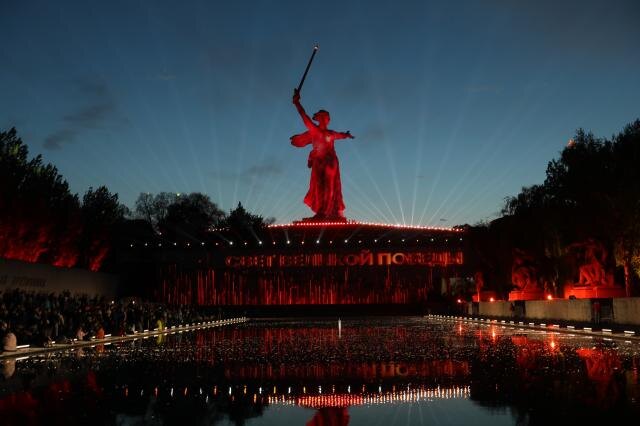 На Мамаевом кургане в Волгограде сегодня вечером, 7 мая, начались показы «Света Великой Победы». Зрители смогут увидеть красочное зрелище девять раз в течение трёх дней. Как сообщили РИАЦ в пресс-службе областной администрации, величие подвига защитников Родины в юбилейный год Великой Победы можно посмотреть 7, 8 и 9 мая. Сегодня, 7-го числа, и завтра, 8-го, проекции будут транслировать в 21.00, 22.00 и 23.00. В День Победы будет немного иной график: в 21.00, 21.45 и 23.00. Каждый показ завершит фейерверк. В этом году впервые в истории патриотического проекта, ставшего визитной карточкой региона, задействовали большую, чем обычно, территорию – от подножия мемориального комплекса со стороны проспекта Ленина до главной скульптуры. На аллее пирамидальных тополей транслируют сюжеты «Награды Великой Отечественной войны» и «Часовые Победы», у скульптуры «Стоять насмерть!» – «Хронику Великой Отечественной войны». Кроме того, на больших экранах посетители посмотрят ролики «Города-герои» и «Гор