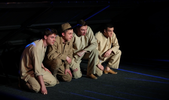 Постановщики использовали минималистичные изобразительные средства. На сцене мы видим наклонный деревянный помост, который в то же время напоминает раздвижные двери дощатого вагона-теплушки. И мгновенно включаются ассоциации – ты думаешь о долгих фронтовых дорогах до Берлина, до Победы.