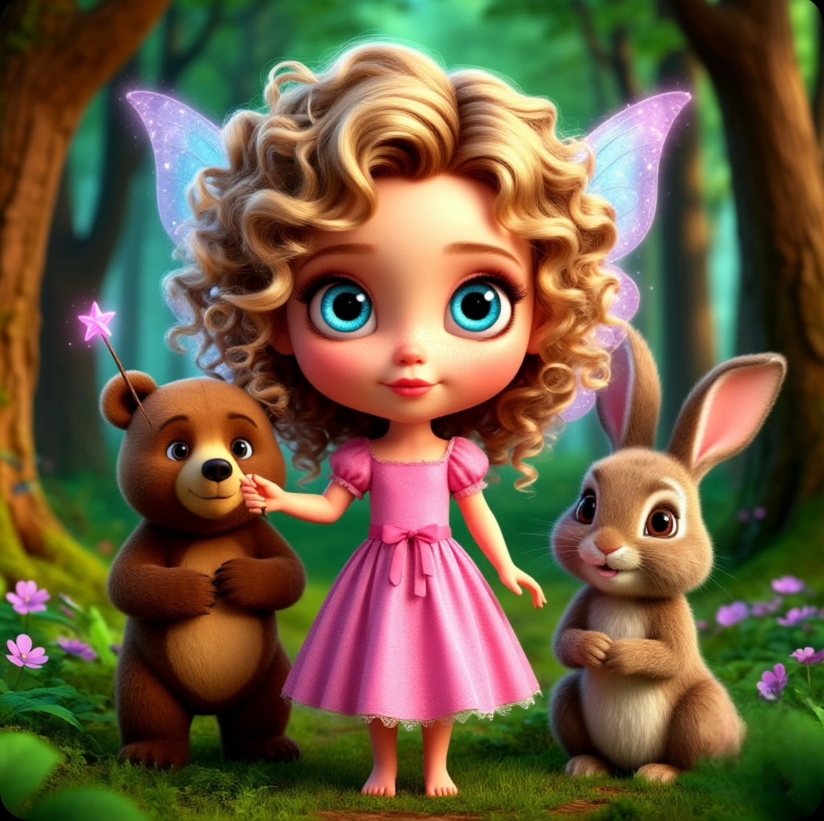 Мариночка обрадовалась и подлетела поближе к медведю. Вместе они отправились в путь. По дороге им встретился пушистый кролик, который весело прыгал по полянке.
