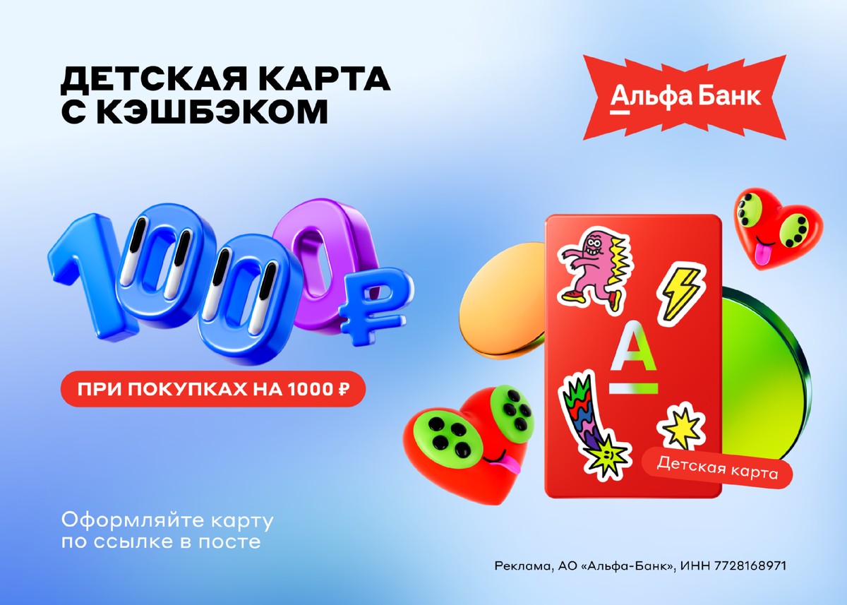 Детская карта, как у взрослого! Карта Альфа-Банка для детей с 6 до 14 лет! Бесплатная навсегда и без условий. - Приложение с финансовыми подсказками и призами. - Расходы под контролем: видно, на что ребёнок тратит деньги. - Кэшбэк 5% в категориях на выбор. - Кэшбэк на всё: вместо одной из категорий». - До 100% в барабане суперкэшбэка. 🎁 За оформление карты по ссылке бонус – кэшбэк 1000р при тратах на 1000р. Гораздо удобнее, чем наличные: безопаснее, можно быстро перевести деньги ребёнку в любой момент и смотреть историю покупок. Плюс возможность научить ребёнка управлять деньгами: копить, планировать расходы, грамотно управлять своим бюджетом. 😍 Яркие стикеры в комплекте, чтобы украсить карту, как захочется! Оформляйте её по ссылке https://kids1251.prfl.me/6238cc608d70de4bf05c082d/yh1jwi?erid=2VtzqvMukUb