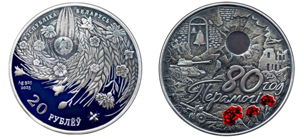 Мы с вами уже порадовались монетам, которые выпустил Банк России к 80-летию Великой Победы. А теперь посмотрим, как это событие отмечено в нумизматике бывших советских республик. В Беларуси выпустили 1 и 20 рублей (в медно-никелевом сплаве и в серебре; дизайн одинаковый). Монета словно пробита пулей; яркими акцентами смотрятся гвоздики и небо. А в минувшем году Беларусь отметила 80 лет избавления своей территории от фашистских захватчиков. На памятных монетах 1 и 20 рублей, посвященных этому событию, изображена карта Беларуси с границами областей, которую ладони бережно защищают от огня. Подробнее о монете Поскольку монеты чеканились на монетном дворе Казахстана, то давайте посмотрим, что приготовил к юбилею Победы Нацбанк этой страны. Коллекционные монеты 200 тенге (из сплава нибрасс/нейльзебер) и 1000 тенге (из серебра с золочением). Вечный огонь и цифра 80 с орнаментом, который символизирует ленту Победы и перекликается с государственным флагом. Но самое главное - биметаллическую м