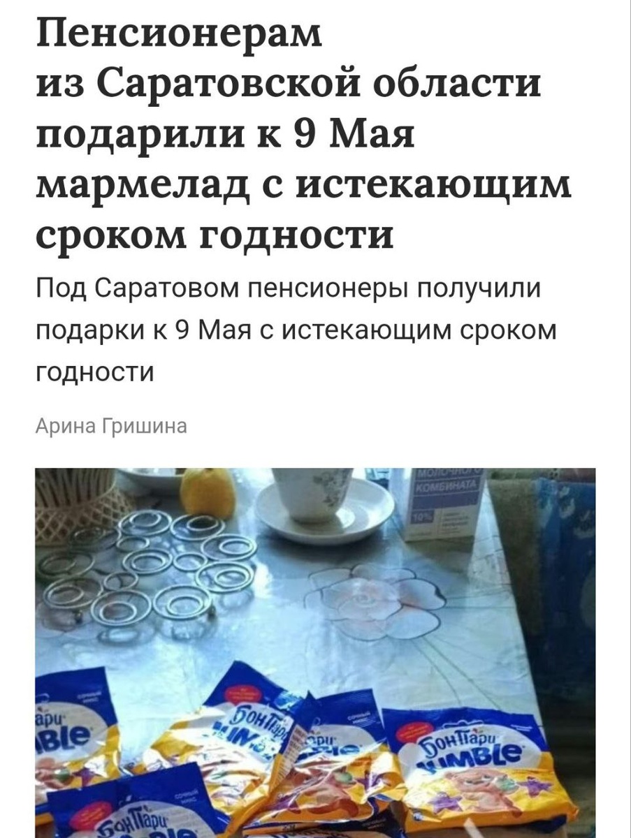 Пенсионерам подарили практически просроченный мармелад Пенсионерам Саратовской области к 9 Мая выдали 15 пачек мармелада с истекающим сроком годности. «Что, для пожилых людей не нашлось другого подарочка?», — возмущается местная жительница, назвав подарок неуважительным. Районная администрация пока не прокомментировала ситуацию.