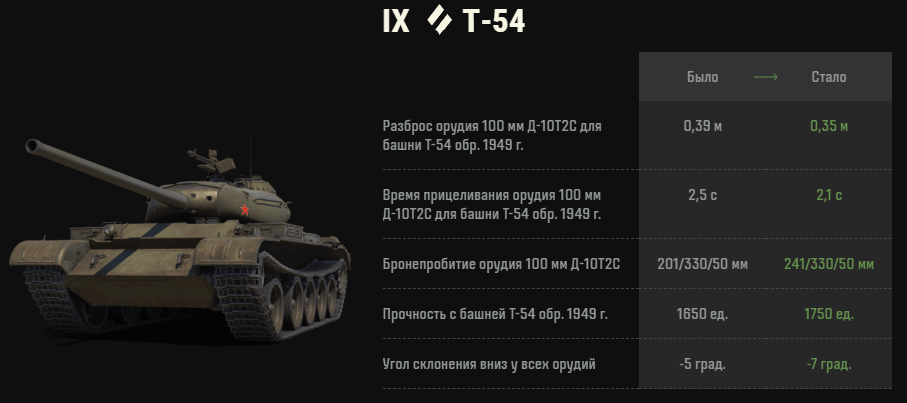 1) Т-54 - средний танк 9лвл. На удивление 54ка сразу взлетела по статке, как только разработчики улучшили комфортность альтернативной пушки и добавили углов склонения орудия. Подробнее по АПу - на скрине ниже.
