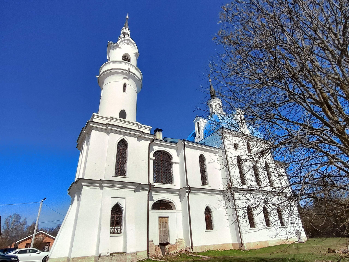 Пожалуй, самой интересной внешне частью церкви является её высокая двухъярусная башня колокольни с обходным балконом при ярусе звона. Многим сегодня она напоминает минарет. Не зря же существует легенда, что в строительстве храма участвовали русский (православный), поляк (католик) и татарин (мусульманин). Я же почему-то вспоминаю сказочные замки.