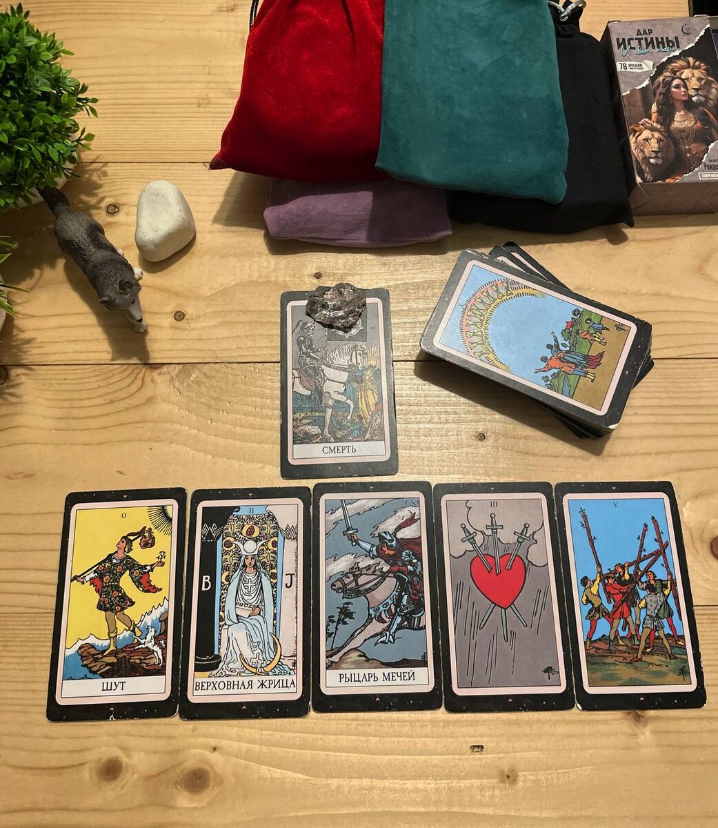 И здесь тоже уже связь с той самой Верховной Жрицей в том, что уходит. Этот рыцарь мечей прям-таки мчится на эту Верховную Жрицу со своим мечом для того, чтобы совершить, можно так сказать, убийство секретов и тайн. То есть на этой неделе мы точно что-то очень важное узнаем, что-то очень важное поймем, и эту новость нам принесет рыцарь мечей. Да, это может быть что-то неприятное, но это требует нашего осознания, нашего принятия и, соответственно, каких-то действий от нас, которые будут способствовать тому, что мы адаптируемся под новые изменения в нашей жизни, опять же, которые приносят нам карты смерти и карта шут.