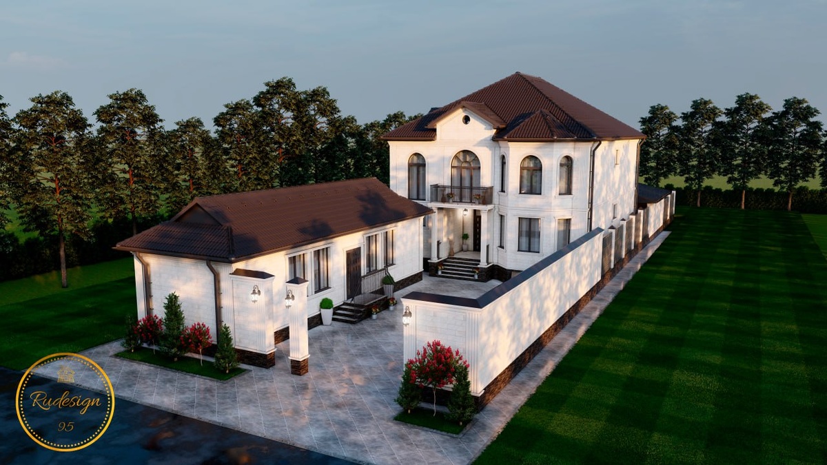 Дизайн фасада двухэтажного жилого дома с использованием натурального камня