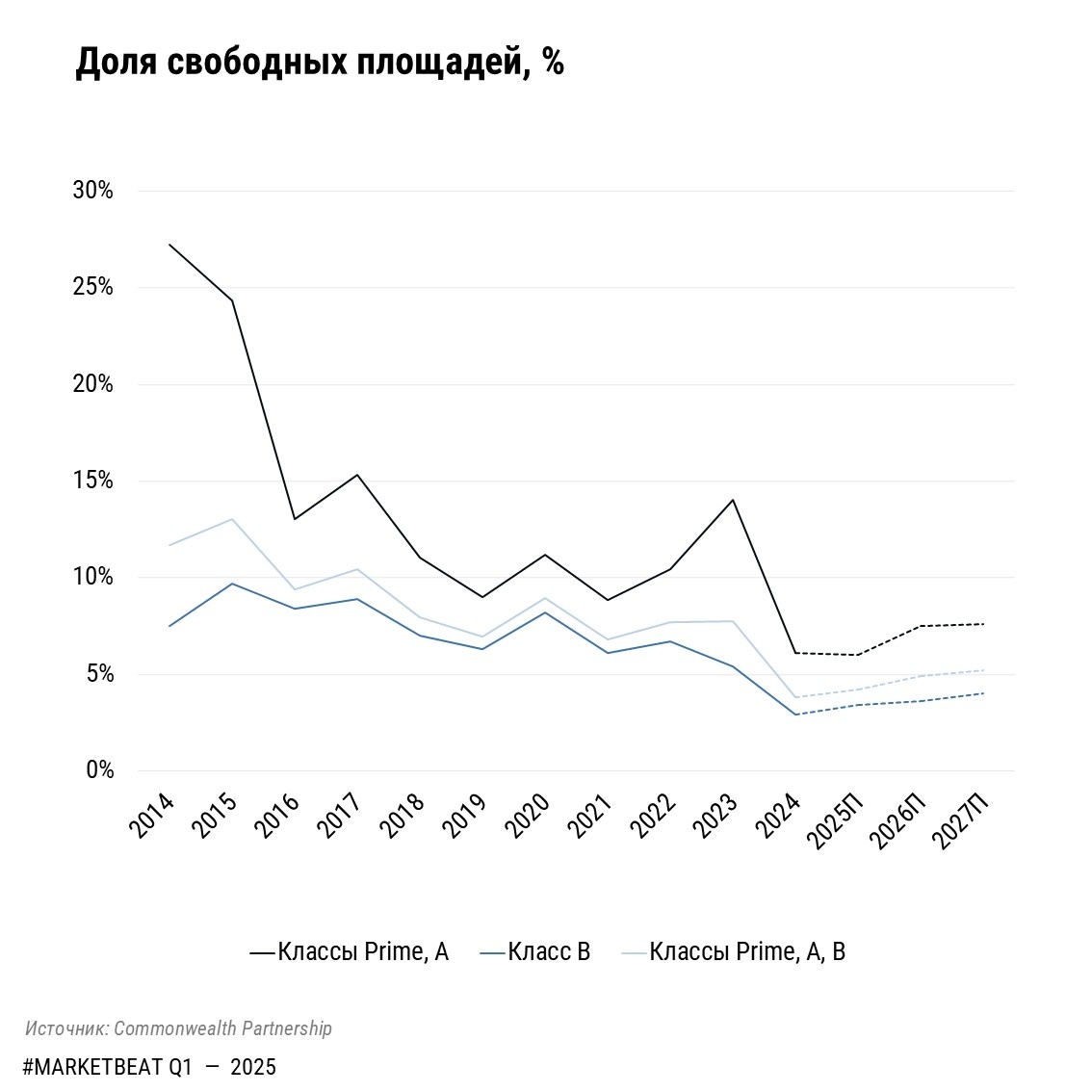 Согласно аналитическому отчету Commonwealth Partnership #MARKETBEAT, уровень вакансии офисных площадей в Москве показал рост на 0,3 п. п. с начала года и составил 4,1%. На площади класса B приходится 60% в структуре вакансии. За 1 кв. 2025 г. доля свободных офисных площадей в Москве (классы Prime, A и B) увеличилась на 0,3 п. п. Вакансия в офисах классов Prime и A составила 6,4%, а в офисах класса В — 3,2%. Во многом рост показателя был обусловлен выходом на рынок 34 тыс. кв. м площадей в аренду в объектах, введенных в эксплуатацию в 2024 г., которые также включают в себя ранее выкупленные помещения в новых объектах. В Москве 5 из 6 офисных зданий не имеют вакансии, что значительно ограничивает вариативность выбора офиса для компаний, а 60% свободных площадей приходится на объекты, введенные до 2014 г. Экспозиция у таких вакансий выше средней по рынку, что говорит об активном вымывании площадей в новых объектах. По итогам 2025 г. мы не ожидаем значительных корректировок уровня ваканси