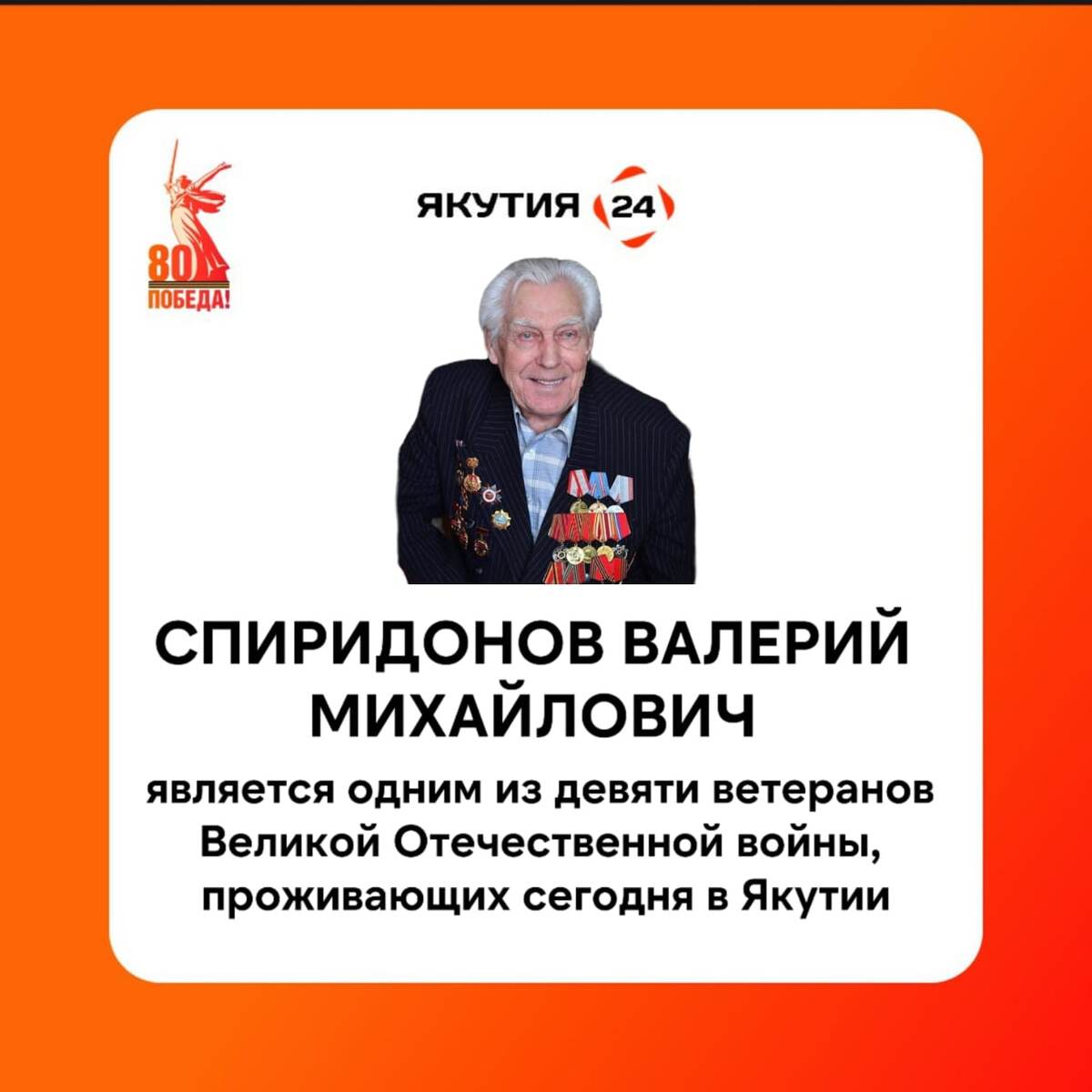 ⭐ Путь к Победе: 80 фактов о Великой Отечественной войне Факт №80: На сегодняшний день в Якутии проживают девять участников Великой Отечественной войны. Один из них — Спиридонов Валерий Михайлович. Валерий Спиридонов родился 4 марта 1926 года. На войну был призван 16 июня 1944 года Алданским военкоматом и прослужил в рядах Советской Армии до 19 июня 1950 года. Воинское звание — младший лейтенант. Место службы — 30-й отдельный мотоциклетный полк связи Забайкальского фронта (на войне с Японией). Награжден Орденом Отечественной войны, медалью «За победу над Японией». Валерий Михайлович Спиридонов — почетный гражданин республики и Нерюнгринского района, ветеран труда. До Дня Великой Победы остался 1 день! Информация: Министерство труда и социального развития Якутии #80фактов_о_Победе_Як24 @Якутия 24