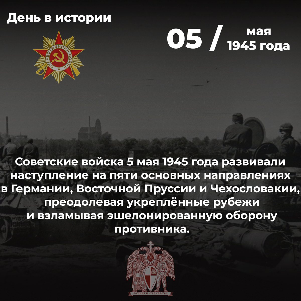 Войска 1-го Белорусского фронта продвигались вперёд юго-западнее Бранденбурга, преследуя в лесисто-болотистой местности остатки разгромленных соединений немцев. Красноармейцы заняли крупные узлы железных дорог Цизар и Рослау. Соединения 2-го Белорусского фронта, овладев городом Волин, сломили сопротивление противника и устремились на север и северо-запад. Одновременно советские части форсировали пролив Пеене, высадили десант на острове Узедом и развернули наступление в восточном направлении. В результате стремительного удара войска разгромили вражеский гарнизон и овладели городом Свинемюнде — одним из лучших по оборудованию портов Германии. Всего в боях за 5 мая советские войска взяли в плен более 20 тысяч немецких солдат и офицеров, захватили 143 самолёта и 450 полевых орудий. До окончания войны оставалось четыре дня. 5 мая 1945 года. До нашей Победы оставалось 4 дня.