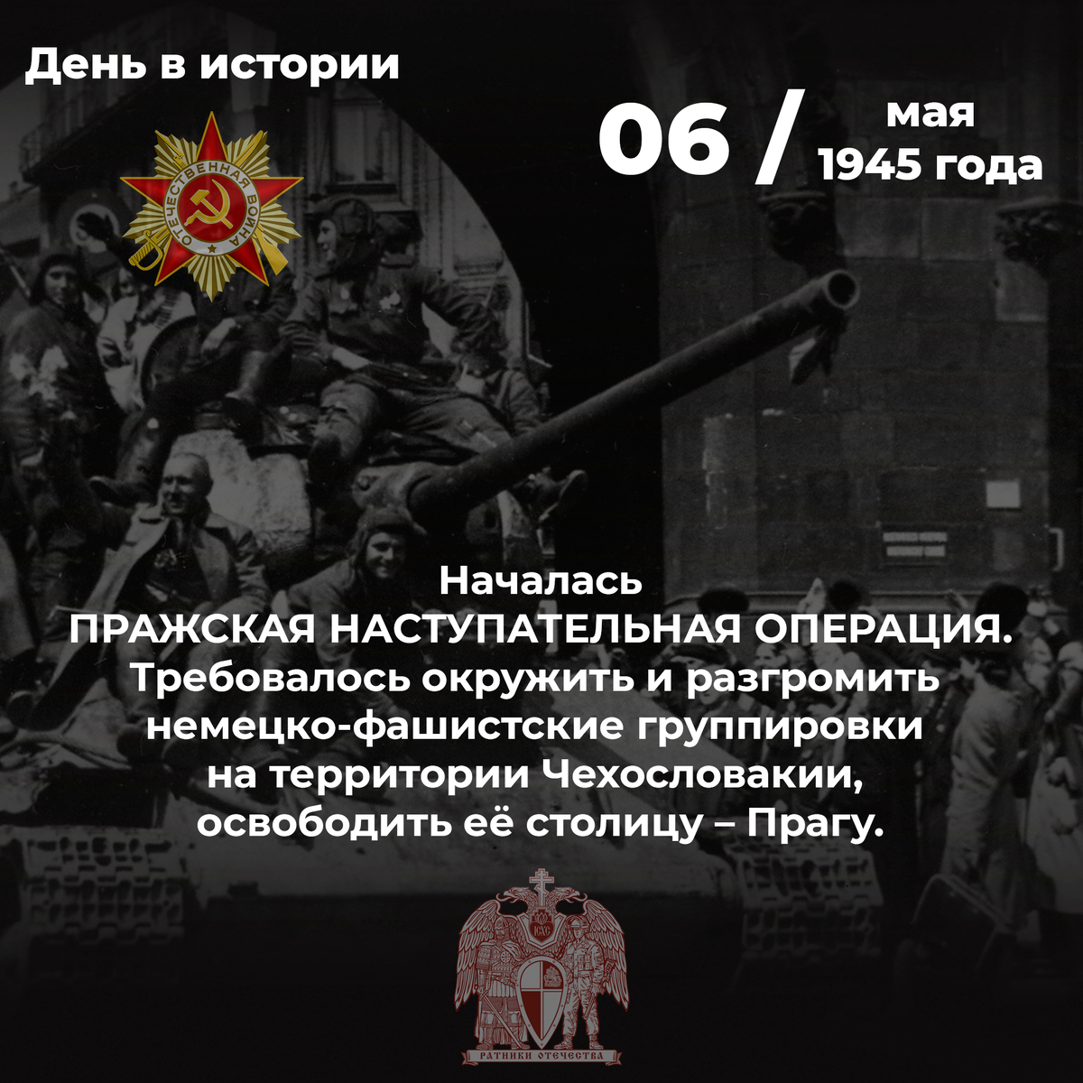 6 мая началась Пражская наступательная операция советских войск 1-го, 4-го и 2-го Украинских фронтов, продолжавшаяся до 11 мая. Главные силы армий устремились на помощь восставшему чешскому народу. Требовалось окружить и разгромить немецко-фашистские группировки на территории Чехословакии, освободить её столицу – Прагу. В связи с обращением повстанцев о помощи, Ставка Верховного Главнокомандования начала операцию на сутки ранее намеченного срока. Главный удар войска 1-го Украинского фронта нанесли в направлении на Теплице и Прагу. На некоторых участках фронта Красная Армия перешла к преследованию отступающего противника. Войска 5-й ударной армии под командованием генерала Жадова ударили в направлении Дрездена по сосредоточившимся здесь немецким танковым дивизиям. Противник, вынужденный обороняться, лишился возможности перебросить силы против восставшей Праги. 6 мая 1945 года. До нашей Победы оставалось 3 дня.