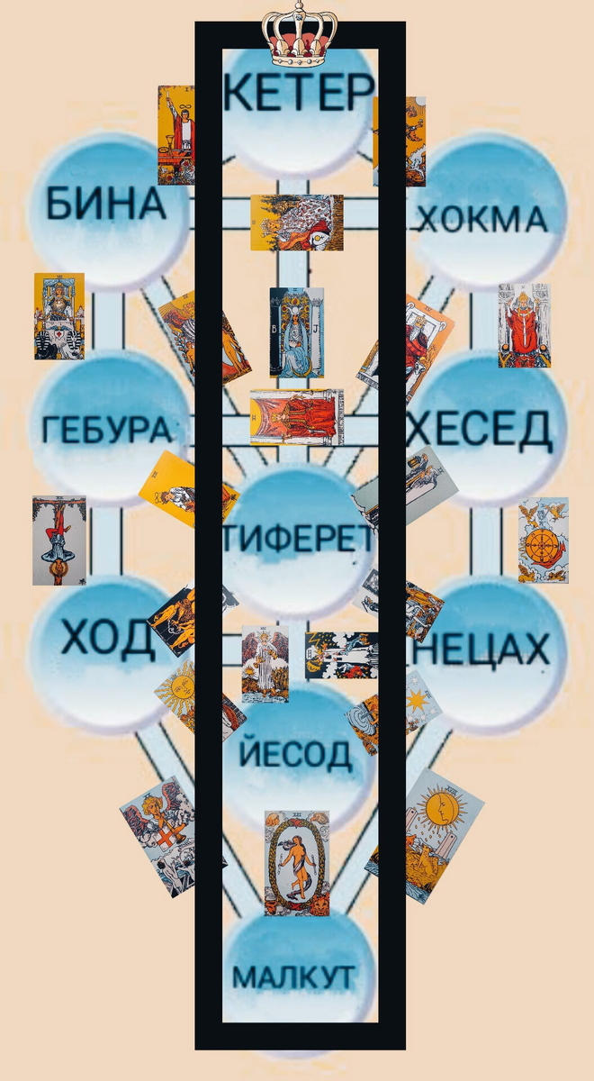 На изображении Древо Сефирот, состоящее из 10 сефир и 22 каналов. Каждая Сефира соответствует планете Солнечной Системы (и младшим арканам таро и картам двора), а каждый канал соответствует энергиям ( и старшим арканом таро), которые трансформируются, переходя из одной сефиры в другую. Объясню на примере, который каждый может «примерить» сам на себя, как мы реализуем наши идеи, которые приходят нам из Сверхразума, от Бога.
