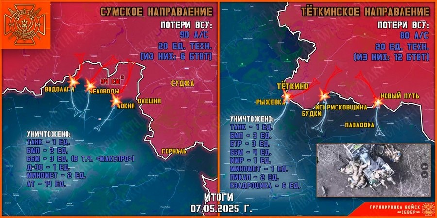 С полуночи на 8 мая начался режим перемирия, объявленный со стороны России. Сегодня утром в группировке войск «Север» ВС РФ, создающей полосу безопасности в приграничье Сумской области Украины и отражающей попытки прорыва ВСУ в Курскую область на Теткинском и Глушковском направлениях, рассказали про обстановку на линии фронта за минувшие сутки. Как отметили Северяне, 7 мая противник не оставлял попыток захвата приграничных территорий в Глушковском районе нашего региона в окрестностях поселка Теткино, не меняя логистических маршрутов, которые усеяны уничтоженной техникой и телами солдат ВСУ. В течение вчерашнего дня отражено семь попыток прорвать нашу оборону на двух участках. На направлении Искрисковщина — Теткино противник четырежды на квадроциклах и при поддержке танка пытался прорваться через государственную границу, после огневого поражения образовав стихийное кладбище. В течение суток продолжалась ликвидация выживших боевиков ВСУ в приграничных лесополосах. Две атаки из Павловки С