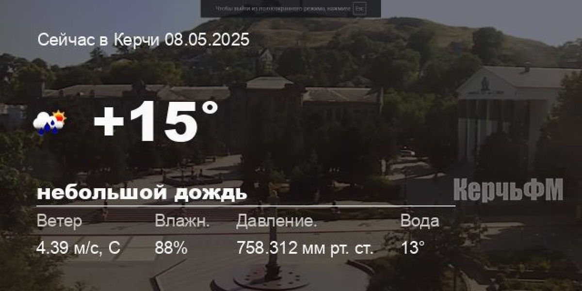 Погода в Керчи 08 мая Сегодня днем в Керчи, 08 мая, ожидается небольшой дождь, температура воздуха от +12.8° до +16°С, ветер северный 2.49 м/с, порывы до 5.31 м/с, давление 759.1 мм рт. ст., влажность 91%. Ближайшей ночью ожидается пасмурная погода, температура +13.7°С. Завтра, 09 мая, в течение суток ожидается пасмурная погода; ночью +13.7°С, днем +14.7°С, ветер северный 4.56 м/с. - Феодосия от +13.1° до +16.3°С, ⛅ небольшой дождь, море: 14°C - Судак от +11.1° до +14... подробнее Подписывайся на КерчьФМ.РФ @kerchfm