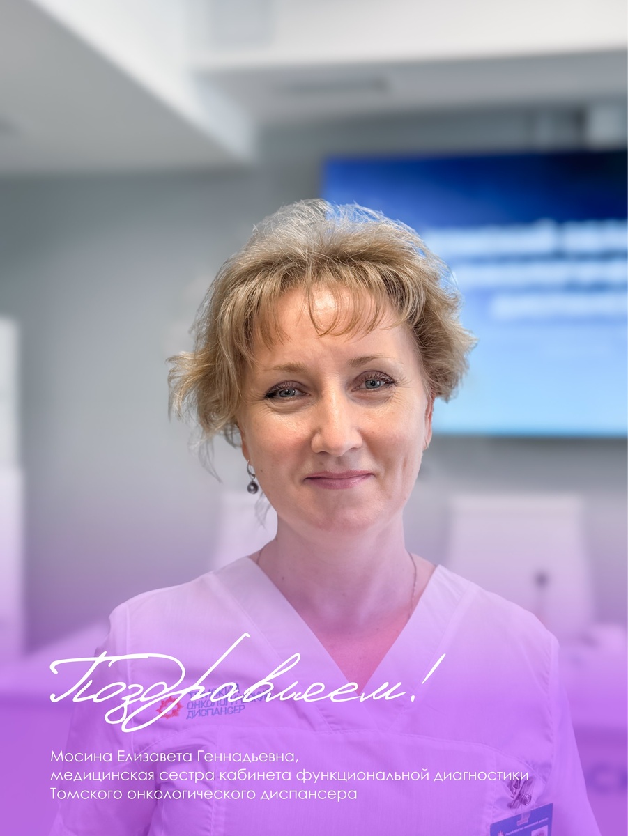 Поздравляем с юбилеем Мосину Елизавету Геннадьевну! Елизавета Геннадьевна — специалист с более чем 26-летним стажем в медицине, 5 из которых она надёжно и добросовестно трудится в команде Томского онкологического диспансера. Сегодня она работает медицинской сестрой по функциональной диагностике, обладает высшей квалификационной категорией и заслуженно пользуется доверием пациентов и уважением коллег. Елизавета Геннадьевна, от всей души поздравляем Вас с юбилеем и желаем здоровья, благополучия, душевного тепла и новых профессиональных успехов!