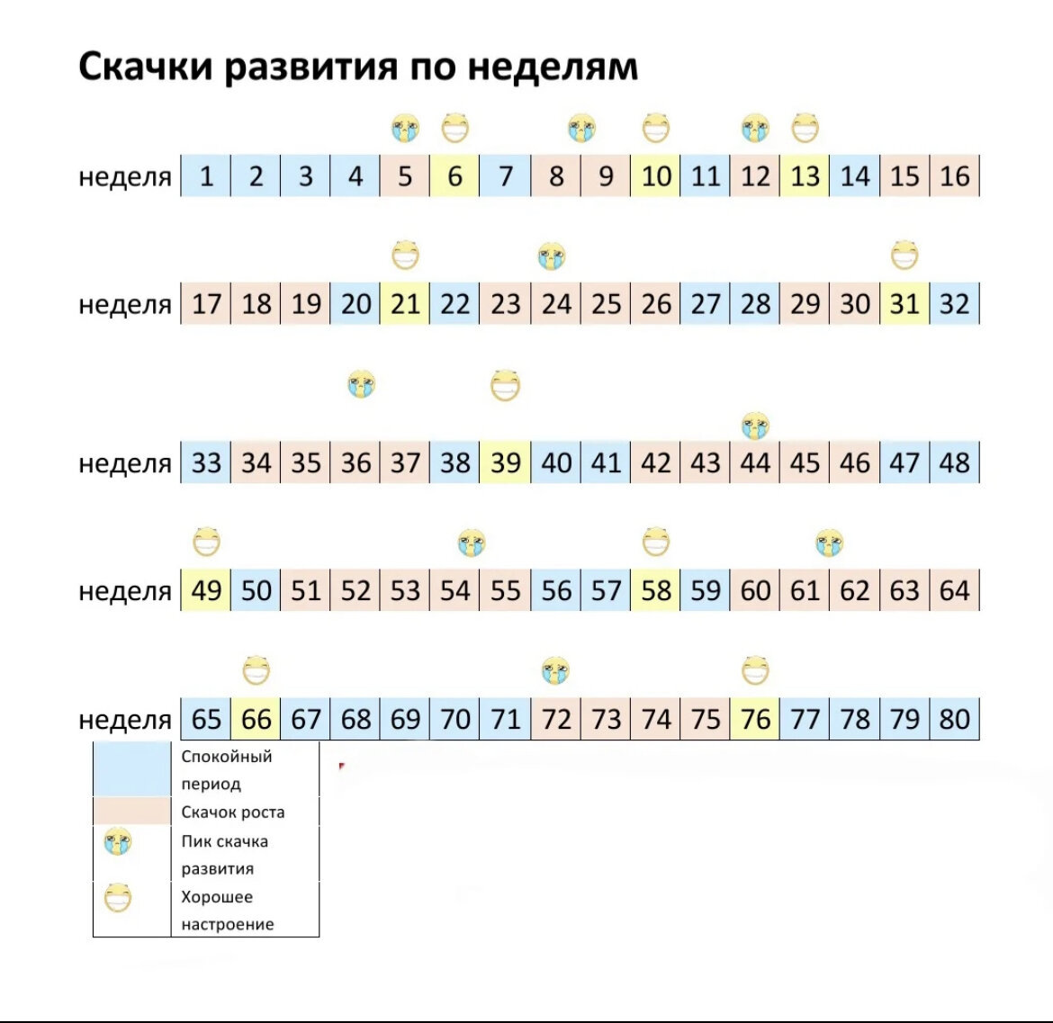 Не так давно столкнулась с тем, что многие не верят в скачки развития/роста. Очень зря. Во-время моей беременности все грамотные врачи мне сказали, что дети растут скачками, что в утробе, что после родов. Потом по мнению многих родивших, я узнала, что скачки развития-это вполне нормальный этап развития ребёнка до 1,5-2 лет, дальше уже идут кризисы лет до 70… Итак, скачки развития. После родов первый скачек приходится на 4-5 недель. Он не такой тяжелый, я его почти не заметила, ребёнок просто начинает понимать принцип «действие-следствия», а также появляется улыбка. Из признаков: Проходит достаточно быстро. Что делать? Качать на руках, вводить ритуалы на сон, не отказывать в груди. Следующий скачек приходится на 7-9 недель. Здесь у малыша улучшается зрение, и мир открывается с другой стороны. Малыш начинает свое взаимодействие с предметами, появляется слежение, отталкивание, небольшой интерес. По признакам: Что делать? Находится рядом, помогать расслабиться, показыват