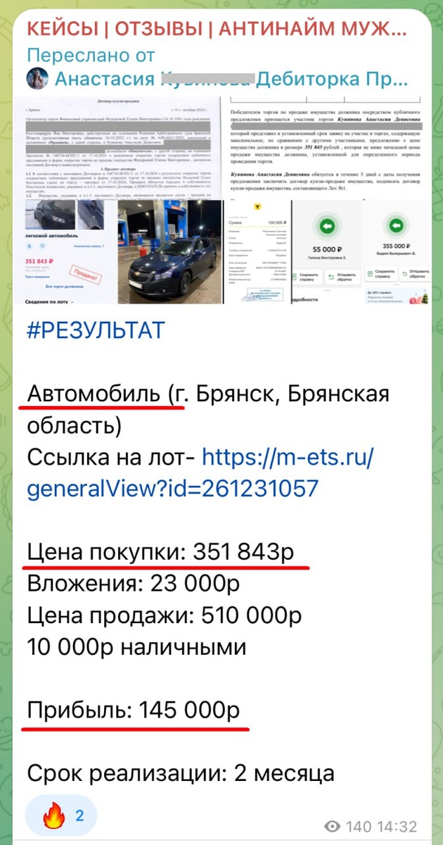 Покупаем с торгов автомобили с дисконтом от рынка и продаём по рыночным ценам. ✅ Опыт ученика 🔥 Автомобиль с торгов по банкротству. цена покупки - 351 843 руб. цена продажи - 510 000 руб. прибыль - 145 000 р. С торгов мы выкупаем с хорошим дисконтом, соответственно, мы имеем преимущество перед обычными рыночными предложениями и люди всегда выбирают нас, когда мы публикуем объявление!