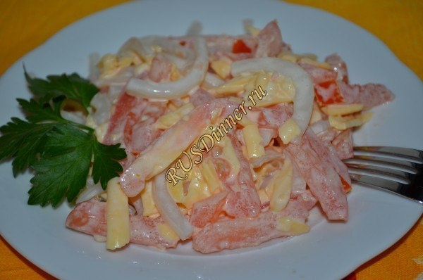 Салат «Красное море» От автора: Салат «Красное море» немного не обычный, но вполне может заменить один из Ваших любимых салатиков. Ингредиенты: Кальмар тушка - 220 гр. Помидоры - 250 гр. Сыр - 100 гр. Чеснок - 2 зуб. Майонез - 70 гр. Источник: https://rusdinner.ru/page/salat-krasnoe-more