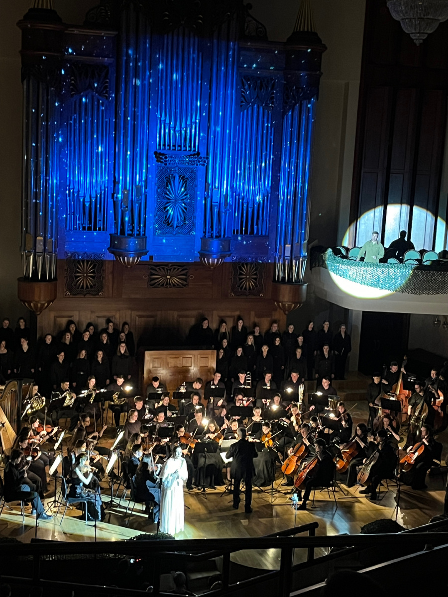 Внизу, конечно, было лучше слышно и видно драматическую игру артистов. Сцена в БКЗ не очень большая, в центре расположился Симфонический оркестр Казанской консерватории и Хор оперной студии. Мне показалось, что основным артистам не хватало места…