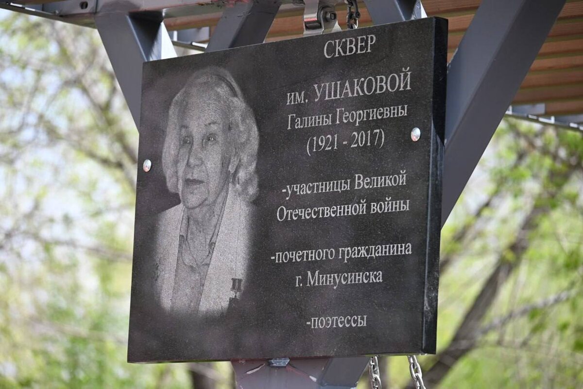 В минусинском Зелёном Бору открыли сквер, названного в честь Галины Ушаковой Галина Георгиевна Ушакова - выдающаяся жительница посёлка, поэтесса, ветеран Великой Отечественной войны и Почётный гражданин Минусинска. Открытие сквера её имени стало замечательным подарком зеленоборцам к 80-летию Победы. Подробнее: https://krasrab.ru/news/society/46141