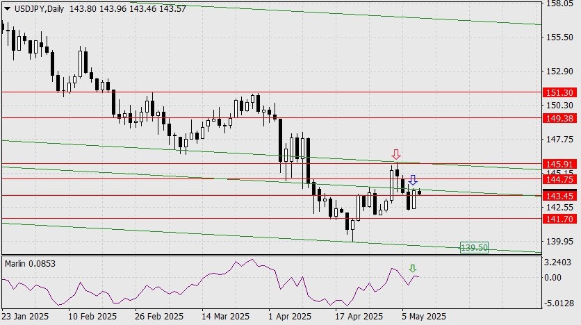 https://basechop.ru/wordpress/?p=41772 USD/JPY На графике дневного масштаба мы видим как цена разворачивается вниз от линий ценового канала зелёного цвета. Первый такой разворот произошёл 2 мая, он отмечен красной стрелкой, второй разворот происходит сегодня с открытия торговой сессии (синяя стрелка). Причём сегодняшний разворот синхронизирован с разворотом осциллятора Марлин от нулевой линии вниз. Закрытие сегодняшнего дня под уровнем 143.45 открывает ближайшую цель 141.70 и одновременно с ней перспективу снижения к нижней границе ценового канала в районе отметки 139.50. Закрытие сегодняшнего дня выше вчерашнего максимума 144.00 откроет альтернативный сценарий с ростом до 144.75 и с перспективой отработки магнитной точки на уровне 145.91, образованную пересечением уровня с линией ценового канала. На четырёхчасовом масштабе разворот осциллятора Марлин от нулевой линии синхронизировался с разворотом Марлина на дневном графике. Это сильный разворотный паттерн. Цена борется с поддержкам