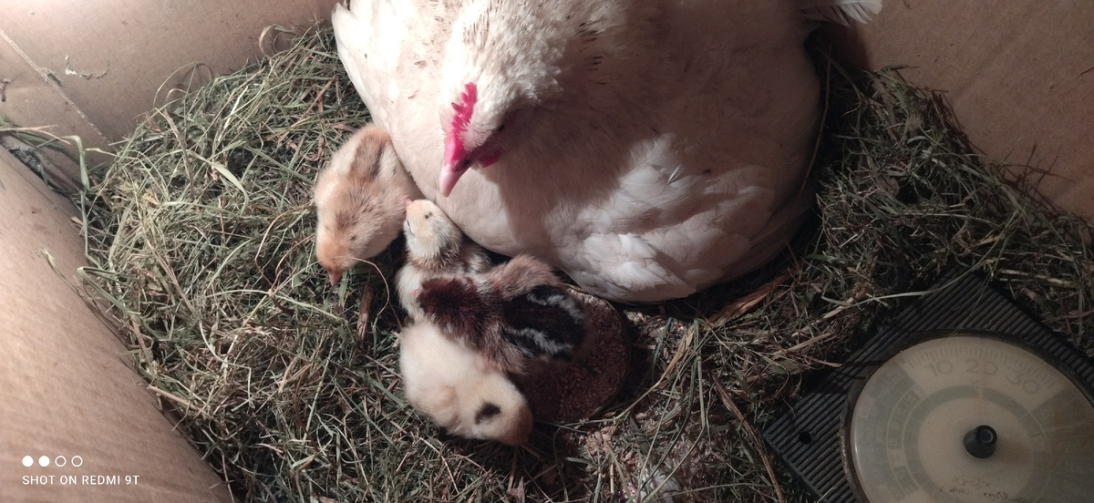 8 мая появились цыплята! Всего 6 штук. Наседка молодая, ей ещё нет и года,, но не все курочки собираются насиживать. А хорошие наседки редки. Было очень холодно. Но много,мало цыплят им нужен уход! Наседка оказалась очень настырной! В первый раз ничего у неё не получилось. Продолжала насиживать! Со второго раза получилось! И вот сегодня у неё радость! 🐤🐣🐥🐣🐤🐣🐥! Молодых кур у нас достаточно, но наседку решила поддержать в её желании! Сердце слабое! Какой уход им необходим? 1. Тепло Создайте «домик»: коробка, ящик или брудер. Под наседкой естественно намного проще. Они практически сутки сидят под мамочкой! Только носики показывают! Поклевали немного и быстрее в домик! А там уютно, тепло! А если инкубатор, то здесь немного надо повозиться! Наденьте лампу (40 Вт или инфракрасную). В первые дни температура под лампой 35–36°C Следите за поведением: Жмутся друг к другу- холодно(добавьте тепла). Расползаются, тяжело дышат - жарко(поднимите лампу или