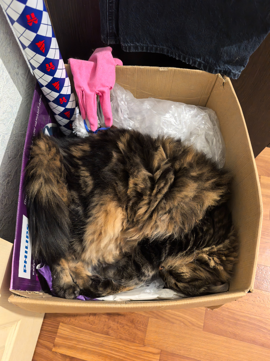 Всем привет! С вами Кузя Кусалочкин и сегодня я расскажу как классно поиграл и почему хозяйка стала злиться. Утром встал вместе с хозяйкой, получил паштетик, поел. Хозяин ушёл на работу, а хозяйка занималась своими делами. Через время хозяйка стала меня искать и не могла найти. А я почему-то решил поспать в этой коробке: Давно тут не лежал. С утра шёл дождь. Хозяйка сказала, что надо радоваться, дождей у нас давно не было, и он нужен чтобы цветочки полить. Посидел на балконе: Ближе к обеду хозяйка куда-то собралась и ушла. Сказала, во сколько дома будет, и, вы знаете, не обманула, пришла вовремя. Вот только игрушки мои не забрала. Она собиралась, но включили сирены, и хозяйка не стала идти. А ещё вечером какие-то мальчики закинули нам мяч в палисадник и начали сильно дёргать калитку. Хозяйка услышала, открыла окно и стала спрашивать, зачем они так калиткой гремят. А потом вышла и достала им мячик. Вернулся домой хозяин, и мы с ним немножко поиграли. Я вспомнил про свой домик: Залез