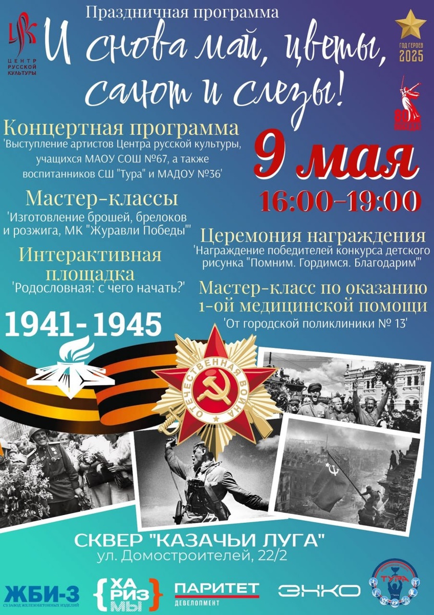 День Победы в сквере Казачьи луга 9 Мая с 16:00 до 19:00 в сквере Казачьи луга пройдет праздничная концертная программа «И снова май, цветы, салют и слезы». Вас ждут: - выступления лучших творческих коллективов микрорайона Тура: артистов Центра русской культуры, юных талантов из школы № 67, воспитанников спортивной школы «Тура» и детского сада № 36; - мастер-классы по изготовлению брошей, брелоков и розжигов. Для самых маленьких — мастер-класс по изготовлению журавлей Победы; - ароматная и сытная солдатская каша; - интерактивная площадка «Родословная: с чего начать?», где можно узнать, как составить историю своей семьи; - мастер-класс по оказанию первой помощи от специалистов поликлиники № 13. Приходите, чтобы всем вместе отдать дань памяти героям, насладиться атмосферой единства и отметить этот Великий День Победы! Ждем вас! По информации организаторов