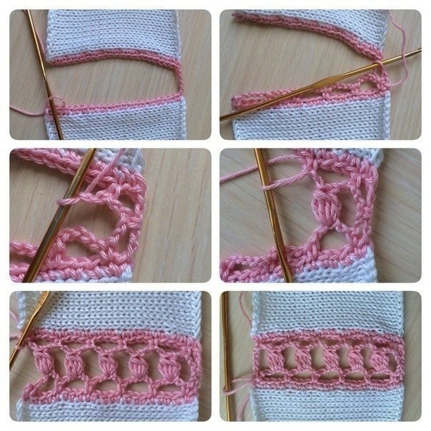Сверху слева направо: 1. Обвязать край полотна столбиками без накида. Тут главное не стянуть и не расфалдить край, поэтому я обвязваю в ритме "три столбика в каждый ряд, один пропустить" . Т.к. Я не очень люблю рвать нитку, то и в обвязке стараюсь этого не делать, тем более "сшиваю" таким образом боковой шов от низа блузочки до края рукава. С учетом ширины кружевца для подъема делаем 5 в.п. и обвязываем вторую деталь. 2. Повернув работу наизнанку, вяжем арочки из 5в.п., с интервалом "три столбика пропустить, в четвертый сделать столбик без накида", довязав таким образом до перемычки из 5 в.п, которая соединяет детали. 3. Две в.п., столбик без накида в середину перемычки, две в.п., столбик без накида в столбик обвязки следующей детали (столбик этот должен быть симметричен нижнему, чтобы обвязка была ровная) 4. Затем вяжем 2 в.п., пучочек из 3, 4, или 5 столбиков с накидом в среднюю в.п. нижней арочки, две в.п., столбик без накида в верхнюю деталь в ритме "через 3 в четвертый". 5. Вот