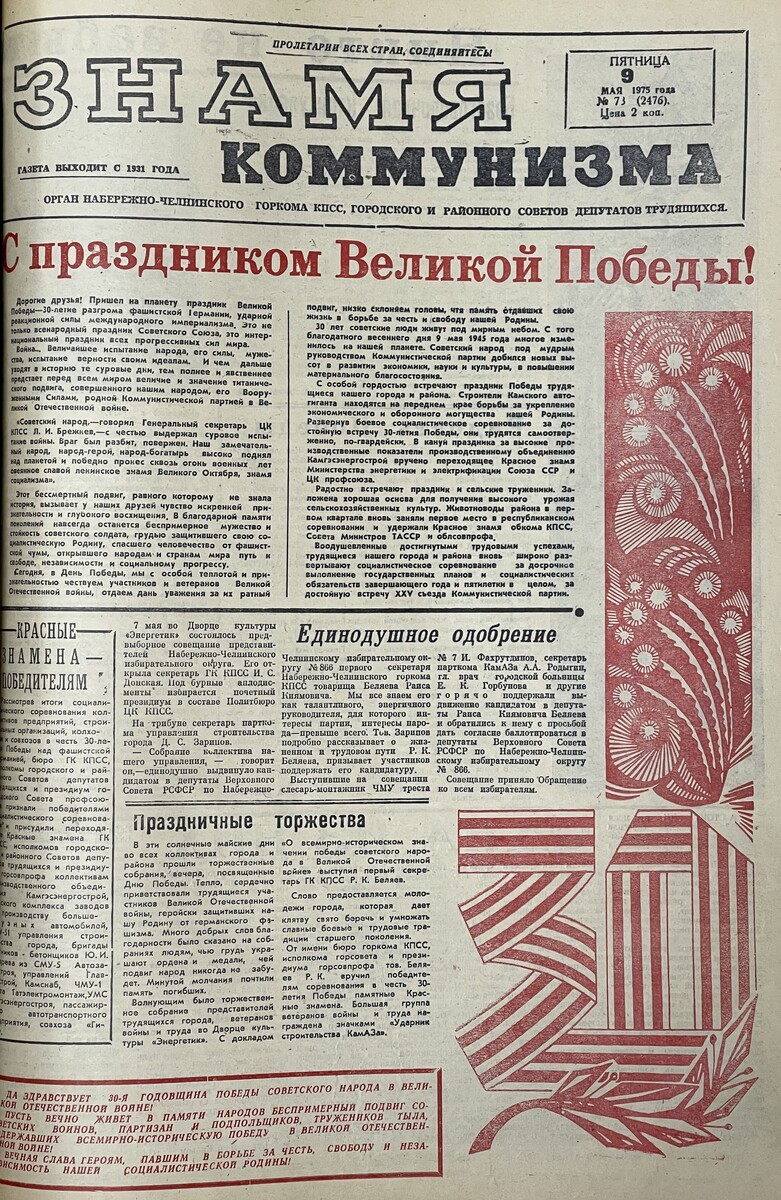 В те годы газета называлась «Знамя коммунизма». Выпуск, посвящённый 30-летию Победы, был настоящим событием: на обложке — яркие иллюстрации в красных тонах, а внутри — воспоминания челнинцев, прошедших войну, стихи и очерки. Этот юбилей стал поистине знаковым для города — именно тогда был открыт мемориальный комплекс «Родина-мать», посвящённый героям-челнинцам, участникам Гражданской и Великой Отечественной войны.