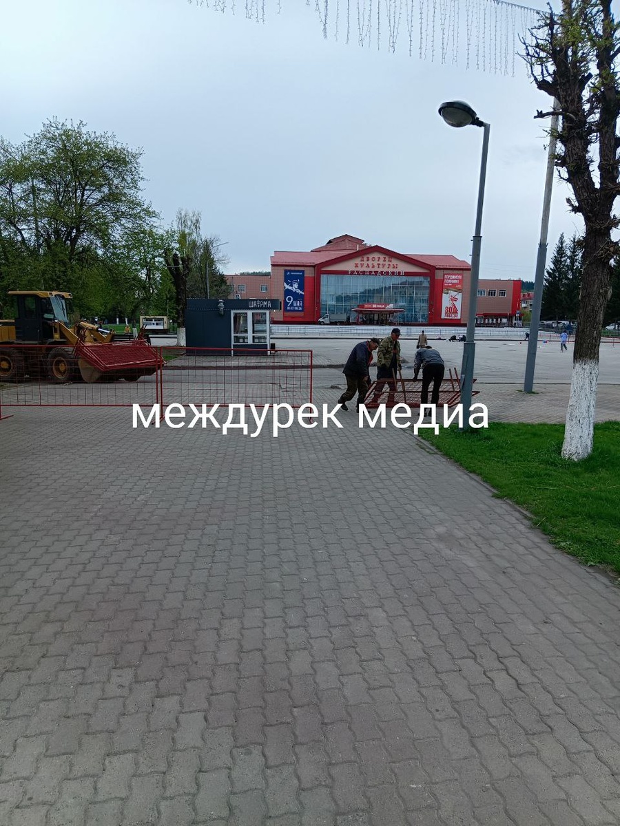 Город готовится встретить 9 мая. На площади весенняя устанавливают ограждения для вечернего мероприятия. Проспект коммунистический между домами перекрывают ограждениями по красной линии.
